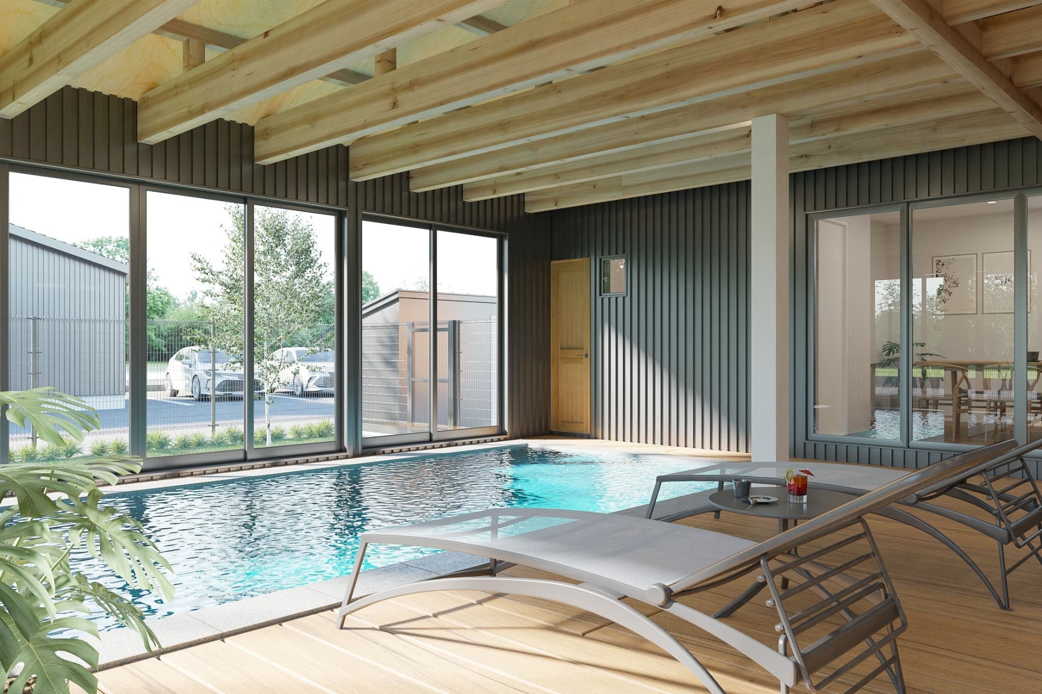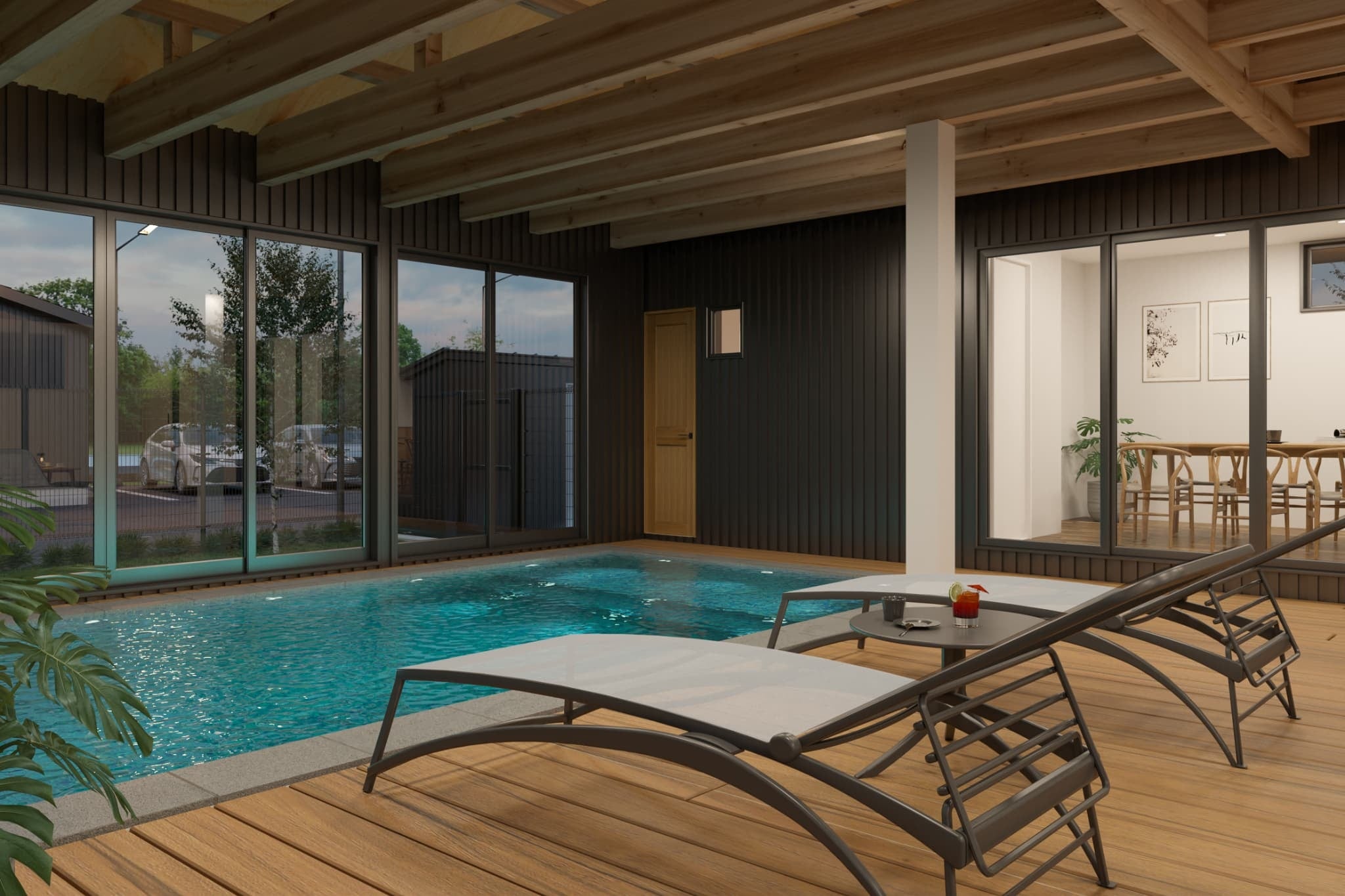 リゾートヴィラ「NEST琵琶湖」には、戸建てヴィラ国内初、屋内30℃温水プールを完備しております。