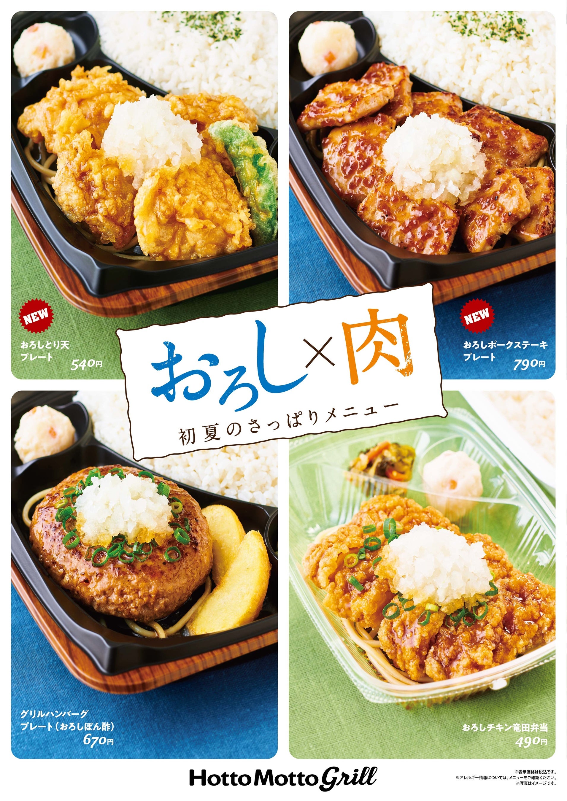 このたび「ほっともっとグリル」は、蒸し暑くなり食欲が減退する季節に、大根おろしでさっぱりと味わう肉メニューが楽しめる、おろしフェアを6月1日(水)より開催いたします。