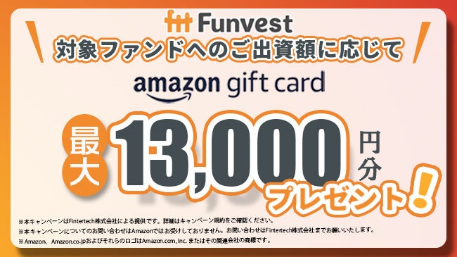 本ファンドへ出資していただいた投資家の皆様を対象として、出資額に応じて最大13,000円分のAmazonギフトカードをプレゼントするキャンペーンも併せて実施いたします。
