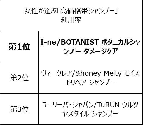 ◆女性が選ぶ「高価格帯シャンプー」ランキング、利用率1位は「I-ne/BOTANIST ボタニカルシャンプー ダメージケア」