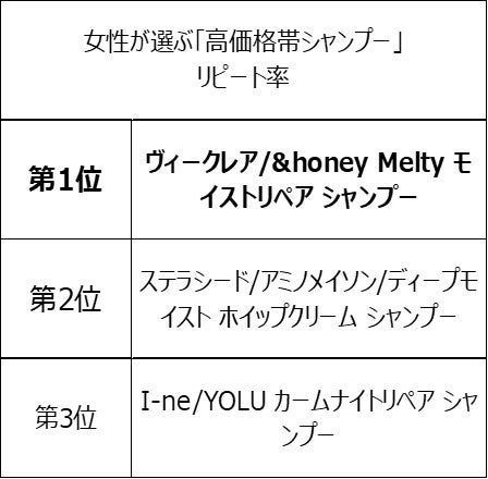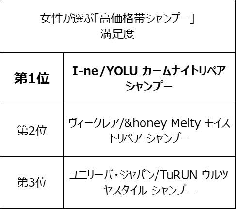 今回の高価格帯シャンプーの調査は2022年12月に実施。ランキング調査は1500円前後の高価格帯のシャンプーを対象に聞いたところ、「I-ne/BOTANIST ボタニカルシャンプー ダメージケア」が女性が選ぶ「高価格帯シャンプー」利用率第1位、 「I-ne/YOLU カームナイトリペア シャンプー」は満足度第1位 、「ヴィークレア/&honey Melty モイストリペア シャンプー」はリピート率第1位を受賞しました。