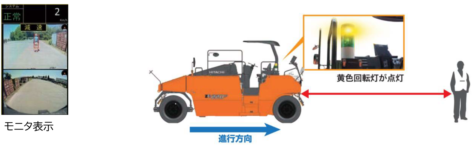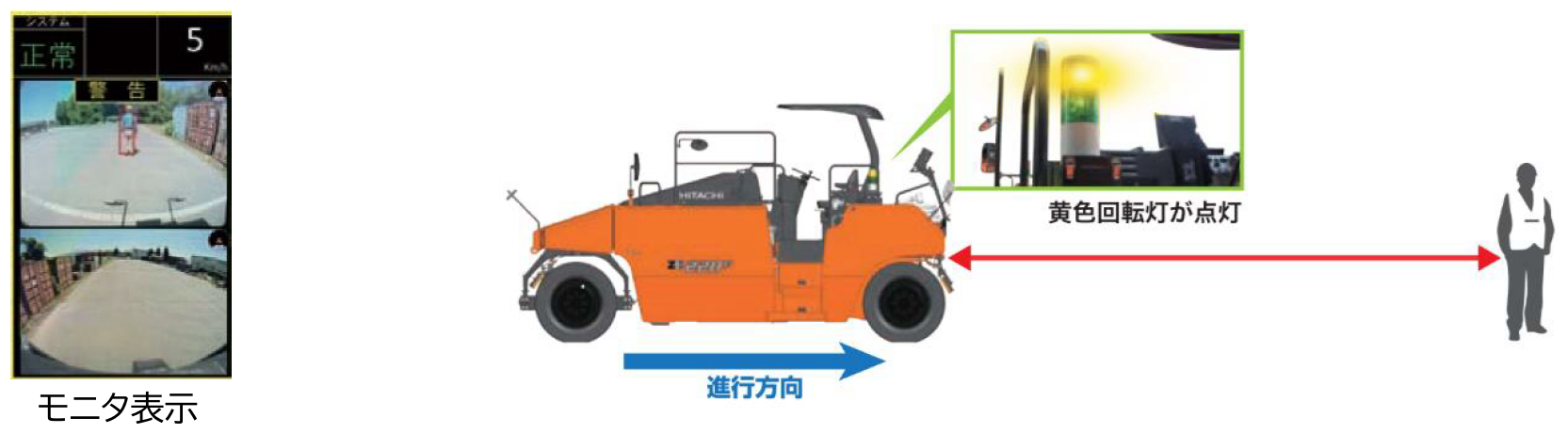 モニタ表示・回転灯・ブザー音でオペレータおよび車体周囲作業者に接近を警告します。