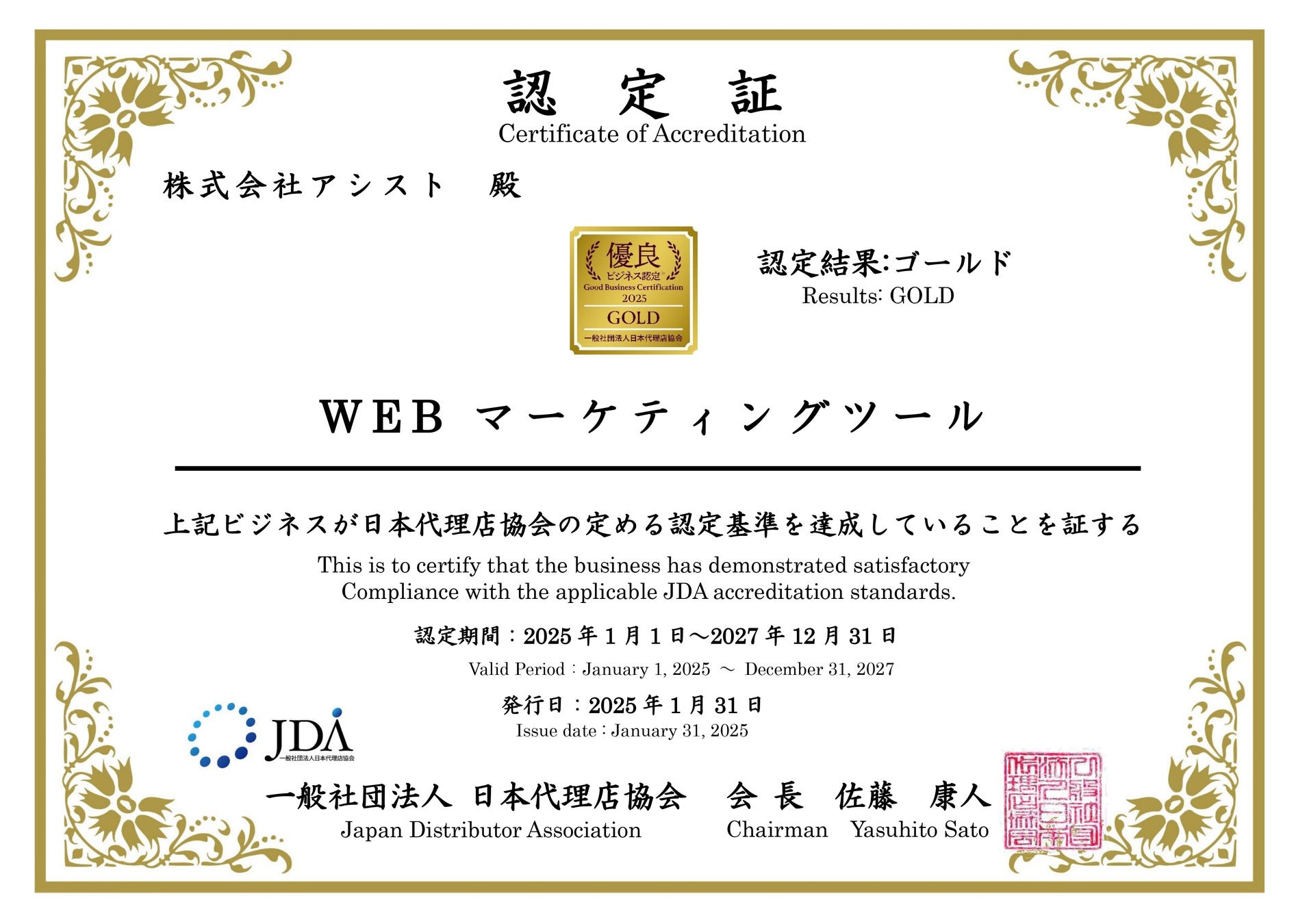 WEBシステムやAI機能の開発、SEO対策やMEO対策、WEB制作やSNS集客支援からサポートまでをワンストップで提供する株式会社アシスト(本社:東京都千代田区、代表取締役:宇井和朗以下、アシスト)が、2025年1月31日、一般社団法人日本代理店協会が主催する「優良ビジネス認定2025」において、最高位であるゴールド認定を受賞したことをお知らせします。
