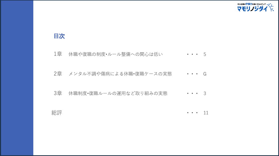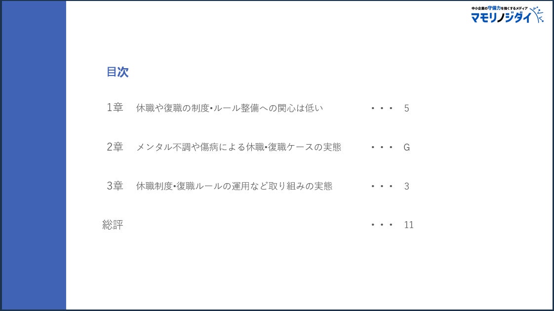 Pマーク、 ISOコンサルにおける支援実績 No.1(注1)のISO/Pマークの取得・運用支援サービス「認証パートナー」を提供し、中小企業の守備力を強くするメディア『マモリノジダイ』を運営する株式会社スリーエーコンサルティング(本社:大阪府大阪市、代表取締役社長:竹嶋 寛人)は、企業における従業員の休職および復職制度に対する理解度や、社内における休職お よび復職に関する状況を把握するため、全国の総務・労務・法務・⼈事担当者(主に中小企業所属)546社を対象にアンケート調査を実施しました。本調査では、企業の休職および復職の実態を明らかにするとともに、今後の課題や解決の方向性を提示しています。
