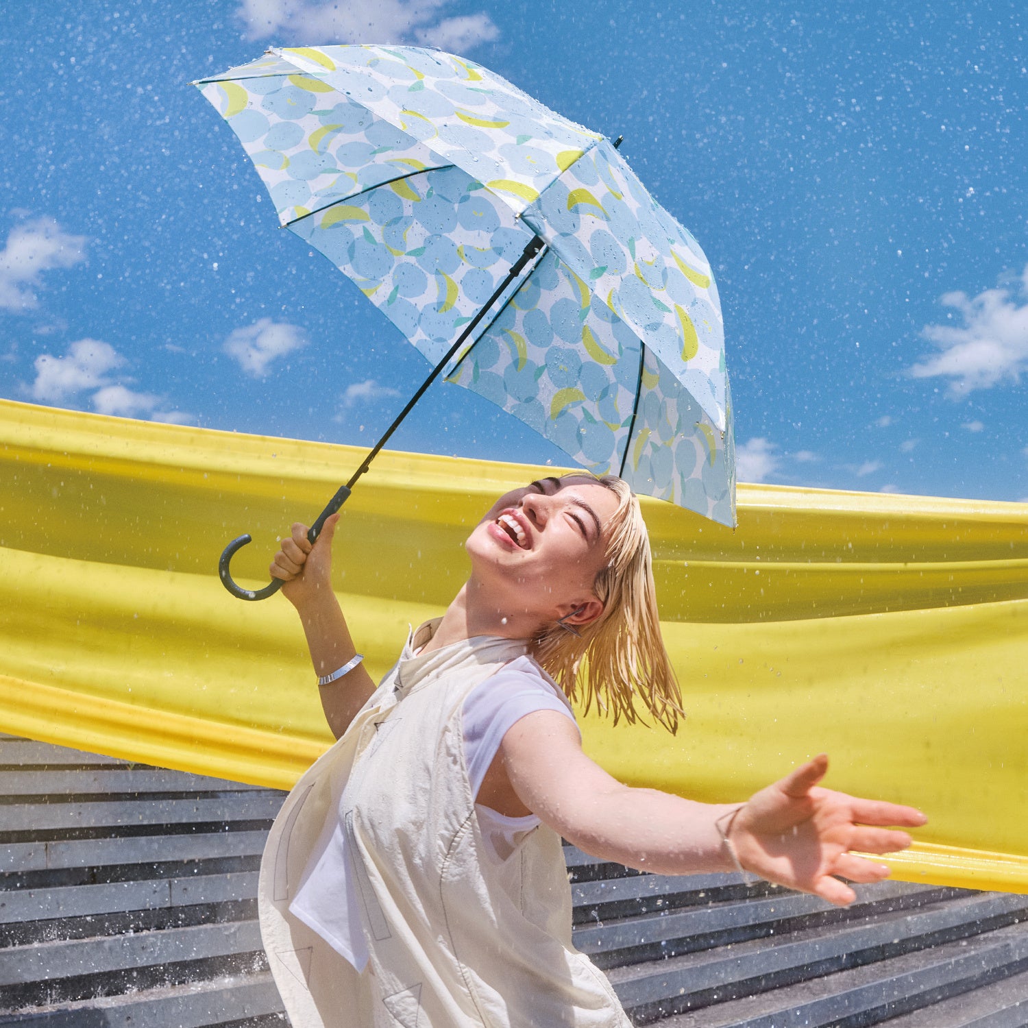 フィンランド語で”りんご”を意味するオメナ。様々な形、向きで並ぶブルーのりんごに差し色となるグリーンを取り入れて、雨の日が待ち遠しくなるような明るいデザインに仕上げました。まさに傘が主役になる1本です。