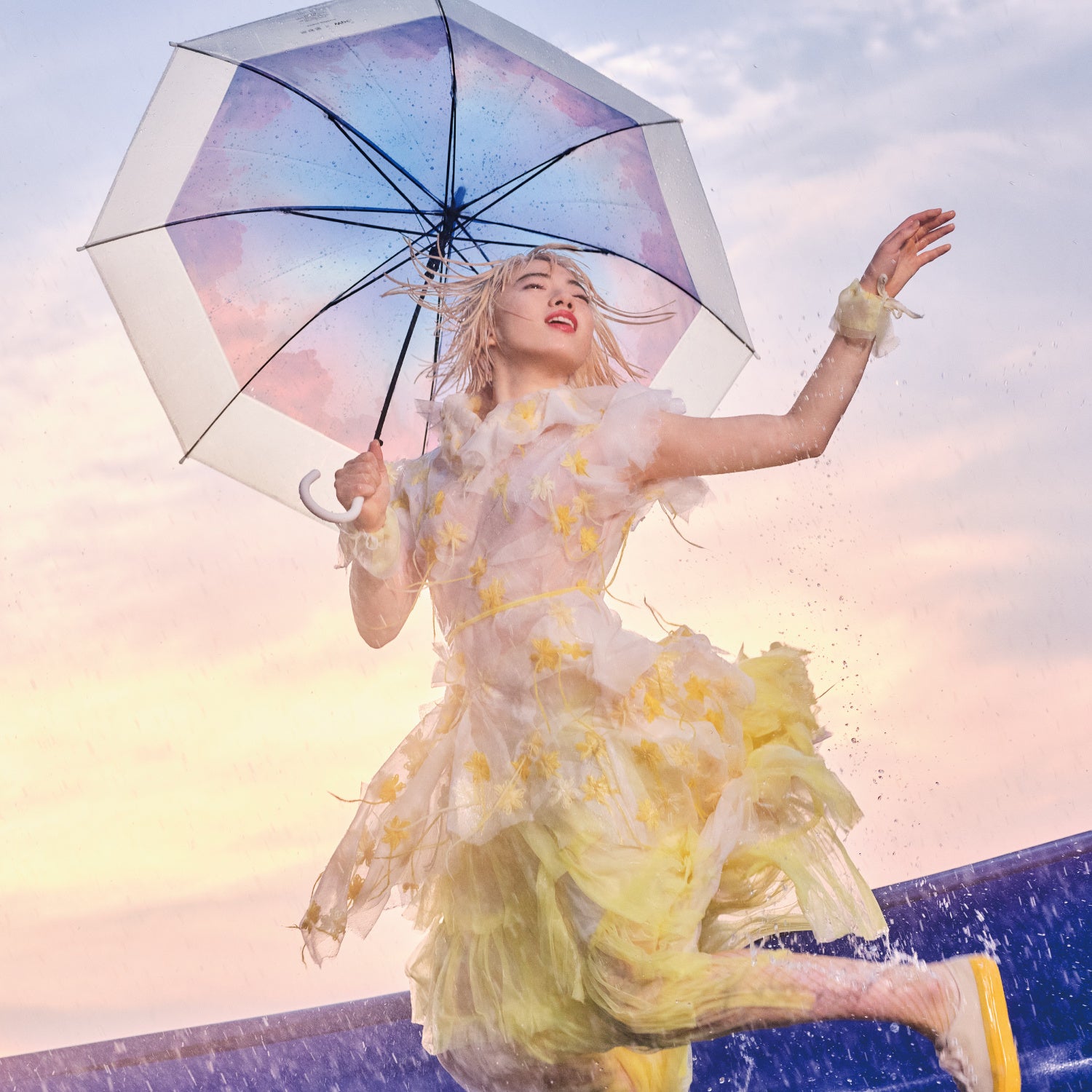 空色アンブレラの淡いグラデーションとイエローのドレスが夕焼け空と重なることで一気に幻想的な雰囲気に。傘の透け感と空のコントラストを楽しめるのもビニール傘ならでは。「さ、躍り出よう。」というテーマを体現するアオイヤマダさんの姿は圧巻です。
