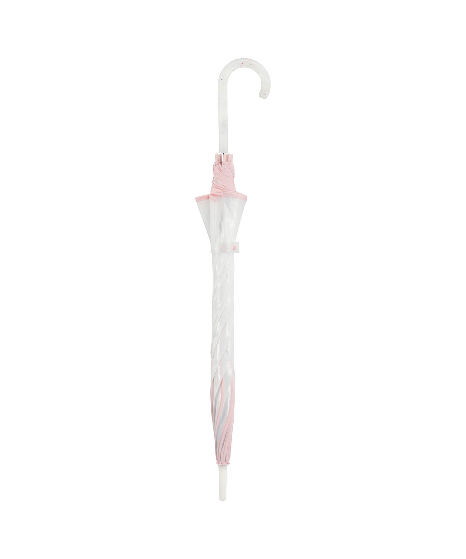 遊び心があるファッションには遊び心のある傘をチョイス。波のようにうねる形と傘を沿うピンクのパイピングが目を惹くビニール傘。カラフルなカラーチップが入った持ち手を合わせることで、個性的でポップな印象になります。