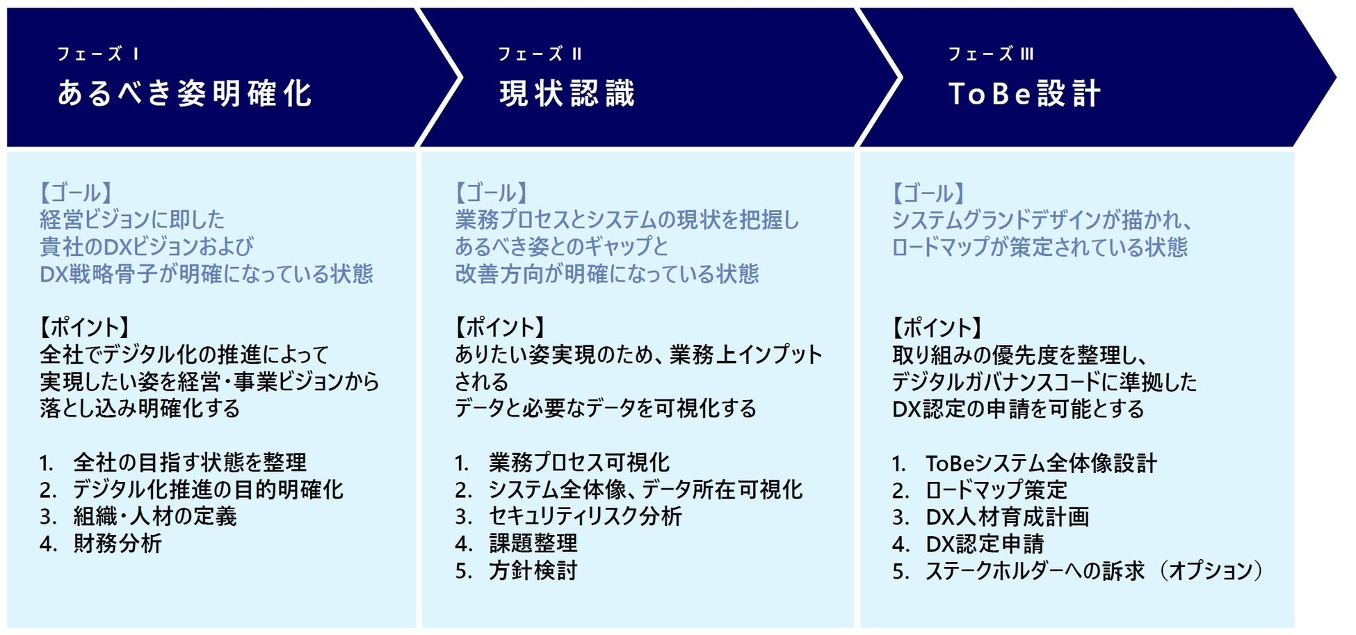 本コンサルティングは、デジタルガバナンス・コード3.0に準拠したDX経営による企業価値向上を目的として推進します。フェーズⅠでは、デジタル化の推進によって全社で実現したい姿を経営・事業ビジョンから落とし込み、あるべき姿を明確化。経営ビジョンに即したDXビジョンおよびDX戦略骨子を策定します。フェーズⅡでは、フェーズⅠで策定したあるべき姿を実現するため、業務プロセスの可視化やシステム全体像・データ所在の可視化、セキュリティリスク分析、課題整理、方針検討を通して、業務上インプットされるデータと必要なデータを整理。業務プロセスとシステムの現状を把握し、あるべき姿とのギャップと改善方向が明確になっている状態を目指します。フェーズⅢでは、取り組みの優先度を整理し、デジタルガバナンス・コード3.0に準拠したロードマップを策定し、競争優位性を確立できるDX認定の申請を可能とします。