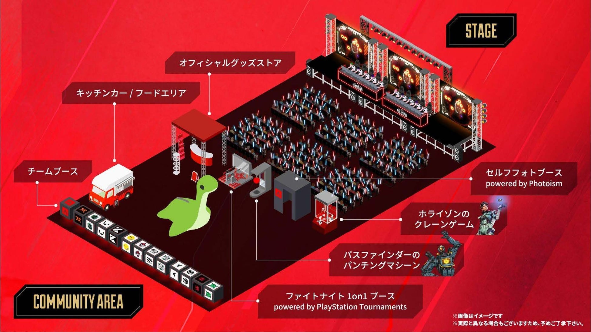 チームブース、プレイエリア、展望エリア、フードエリアなどのApex Legendsアジア最大級のコミュニティエリアが会場で楽しめます。