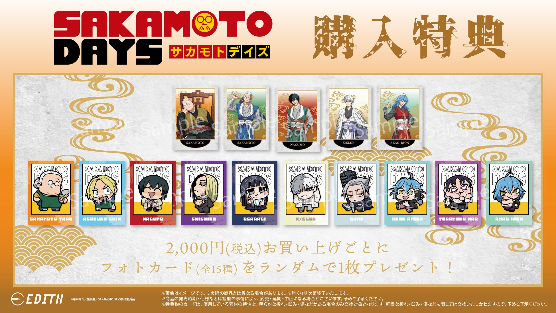 株式会社イーディスは、TVアニメ『SAKAMOTO DAYS』のオリジナル描き下ろしイラスト「五神」と大川ぶくぶ氏によるミニキャライラストを使用した商品をアニメガ×ソフマップ店舗にて先行販売いたします