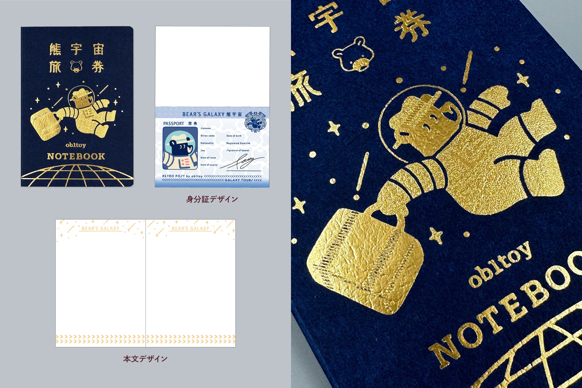 1ページ目はパスポート風の身分証デザイン、本文は無地のため普段使いのノートとしてお使いいただけます。