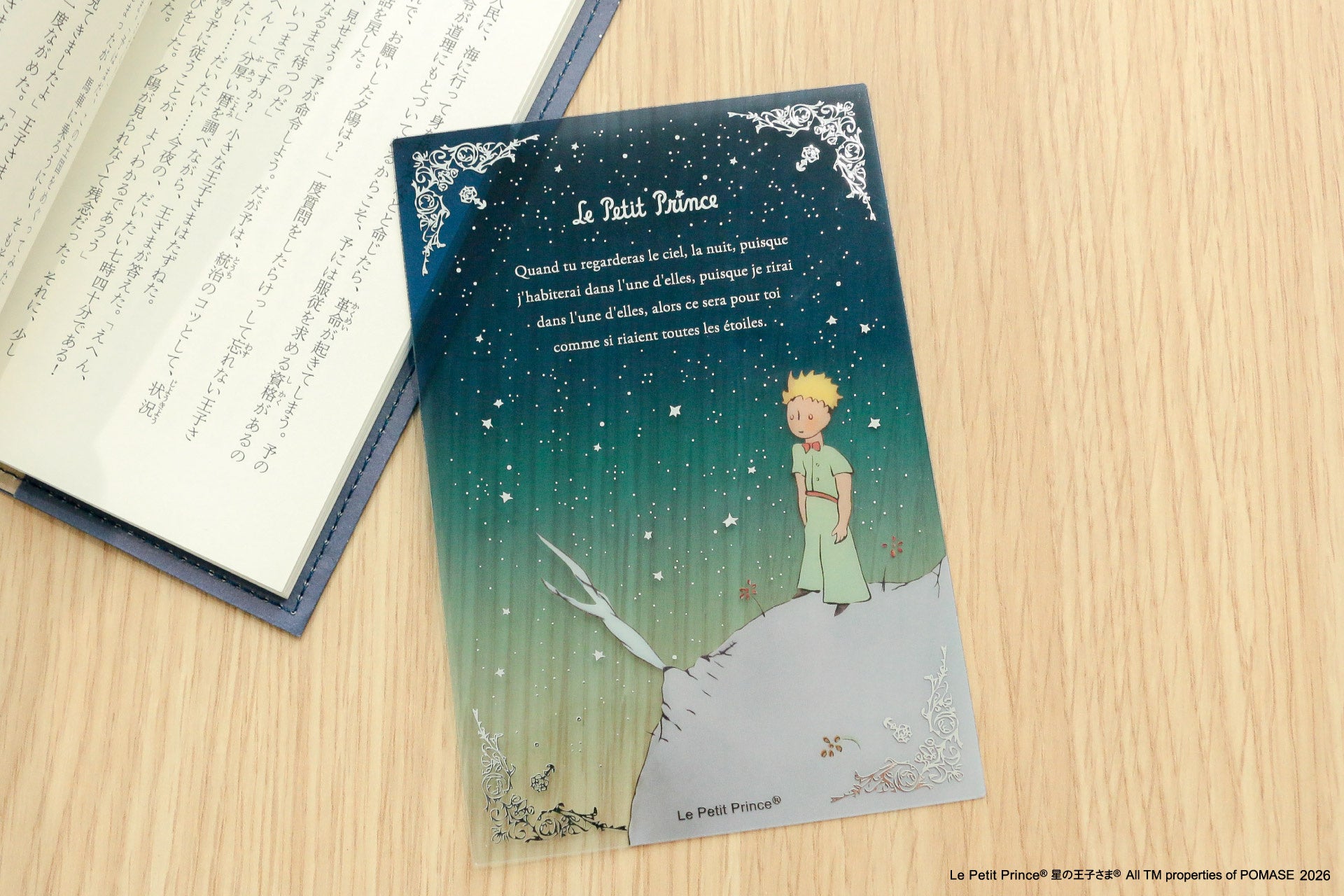 星やバラのフレーム、フランス語原文に箔押しを施し、物語の世界観を表現しています。