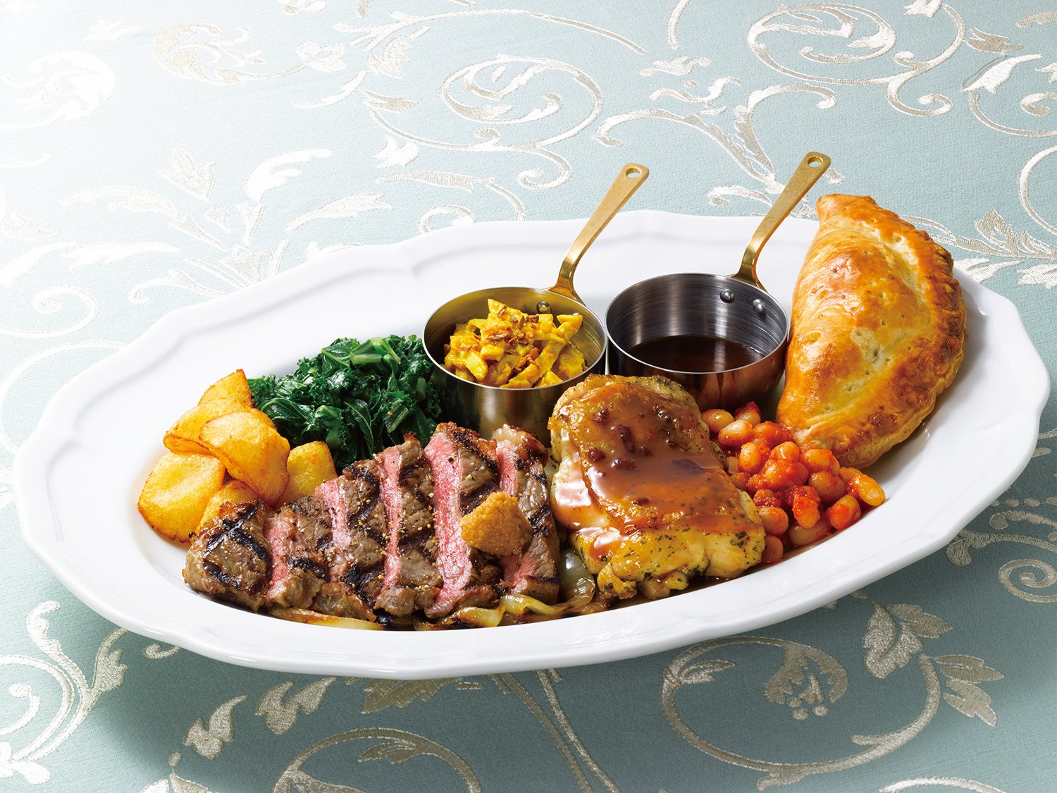 英国で日曜日に楽しむ習慣のある、お肉や野菜などを盛り合わせた「サンデーロースト」をイメージし、ステーキ、カンバーランドチキン、ベイクドビーンズ、コロネーションチキン、パスティなどを盛り合わせた、あれこれ楽しいプレートです。