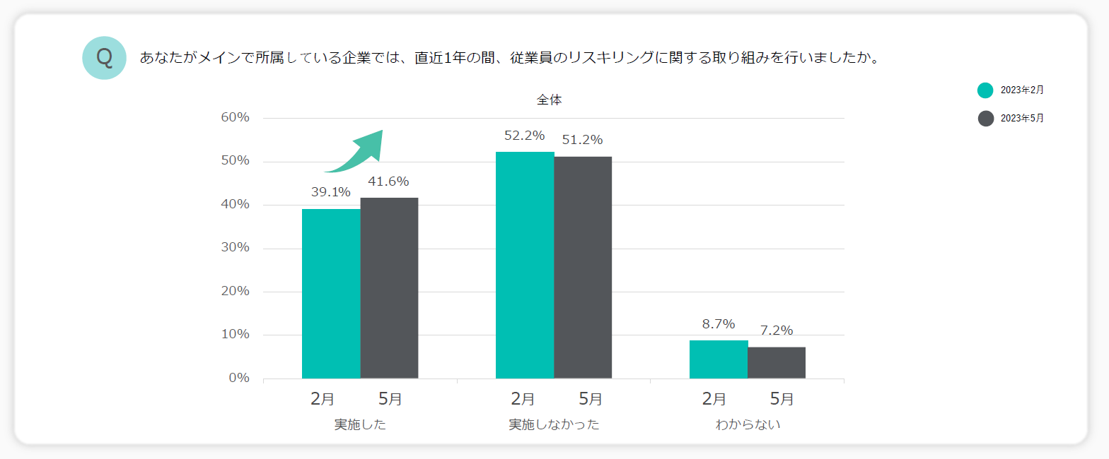 回答者が主に勤めている企業において、「直近1年の間で、従業員のリスキリングに関する取り組みを行いましたか︖」と尋ねたところ、「実施した」と回答した方は、前回は39.1%、今回は41.6%と微増し、今後も伸びていくと思われます。