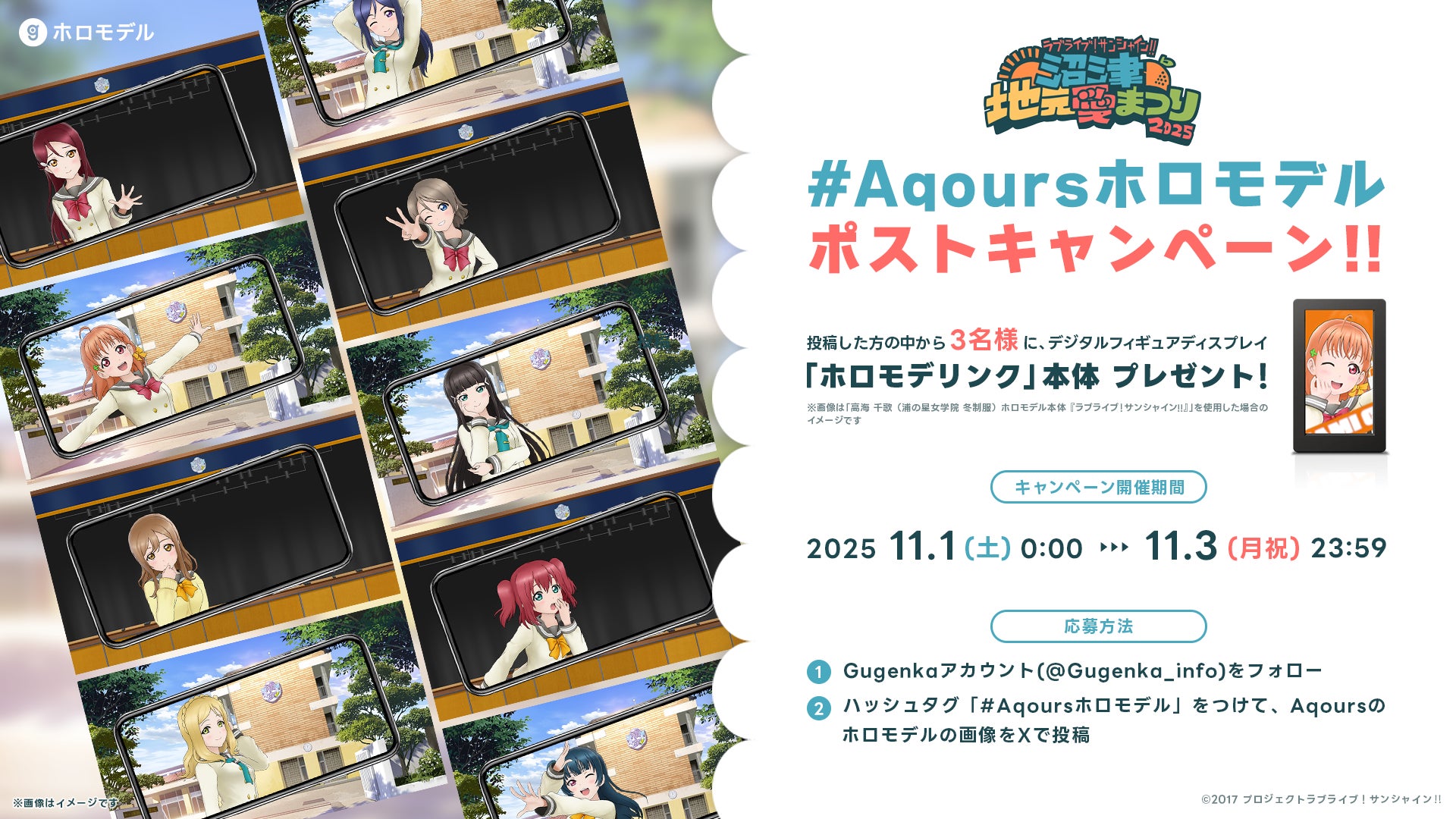 ・ポストにハッシュタグ「#Aqoursホロモデル」をつけている ・ポストに「ラブライブ!サンシャイン!!」のホロモデルを使用した画像が添付されている ・Gugenkaアカウント(@Gugenka_info)をフォローしている方 ・DMをフォロー外から受け取れる設定になっている方 ※当選者には、Gugenka公式アカウント(Gugenka_info)よりDMでご連絡いたします。 |