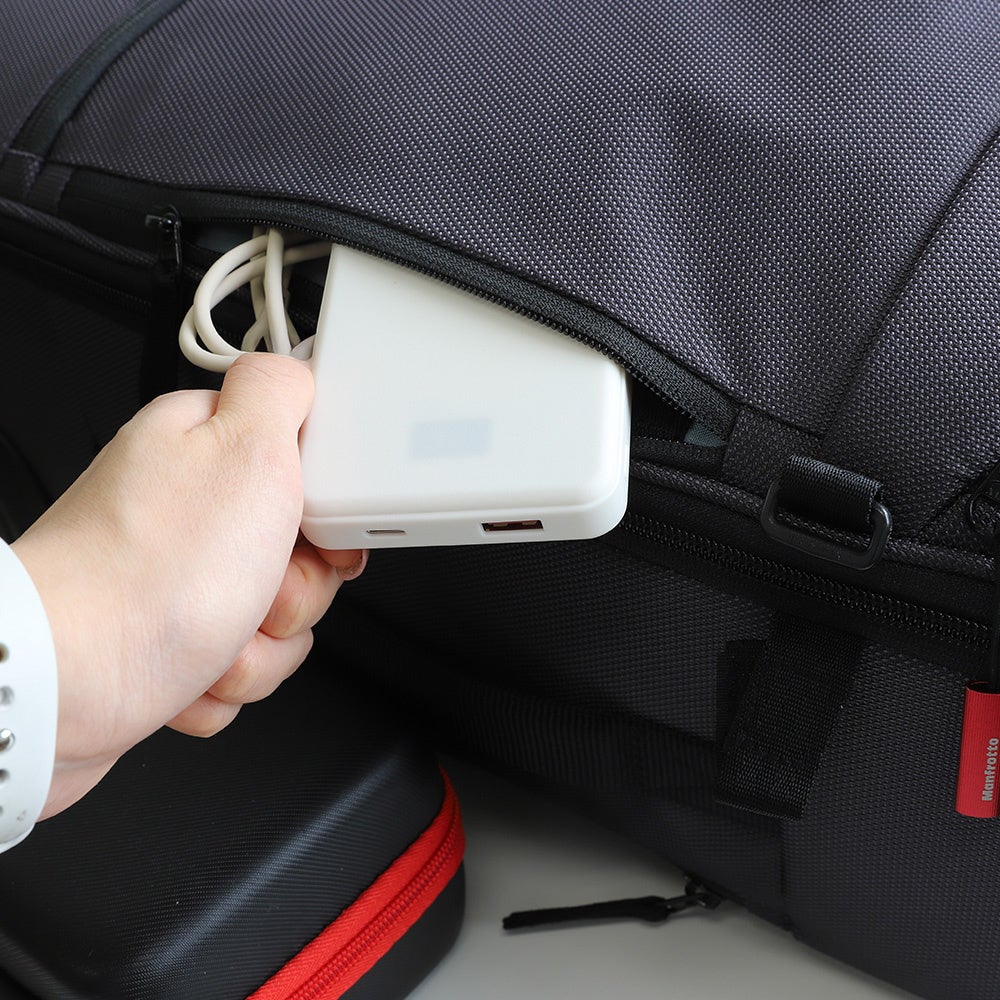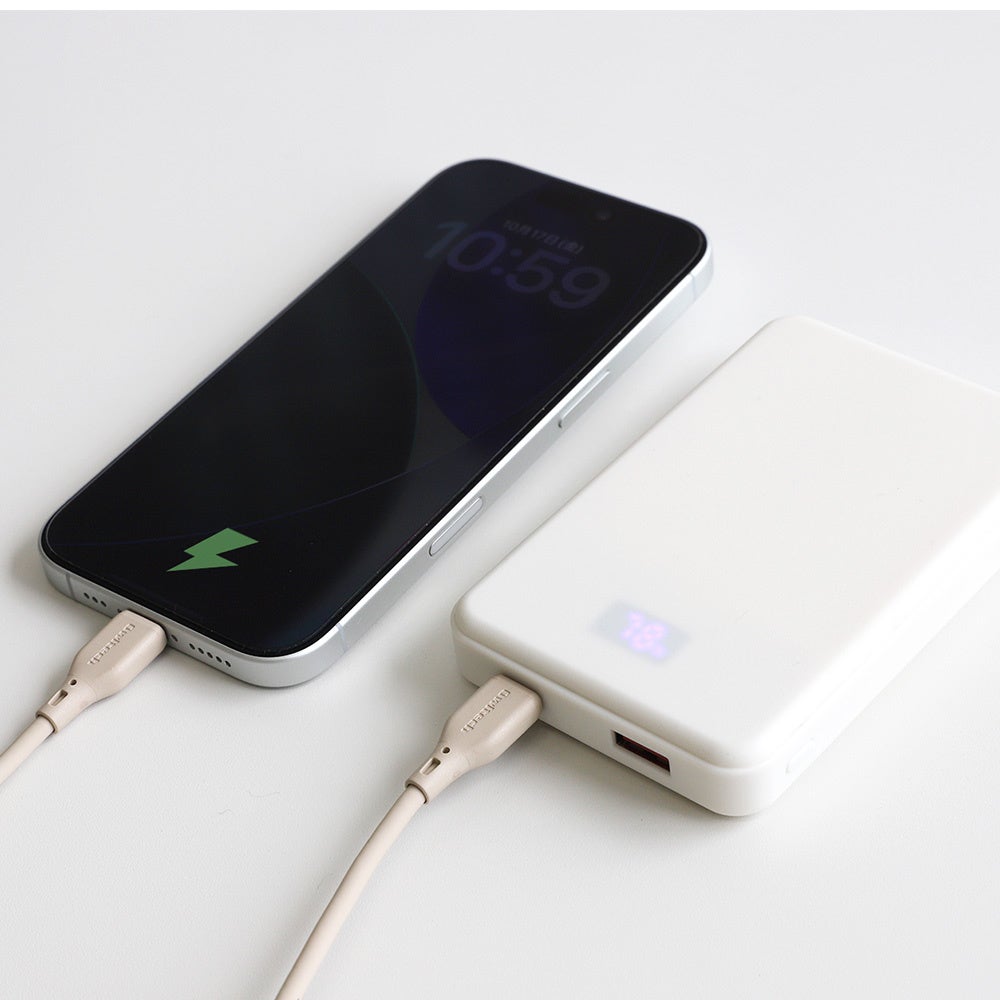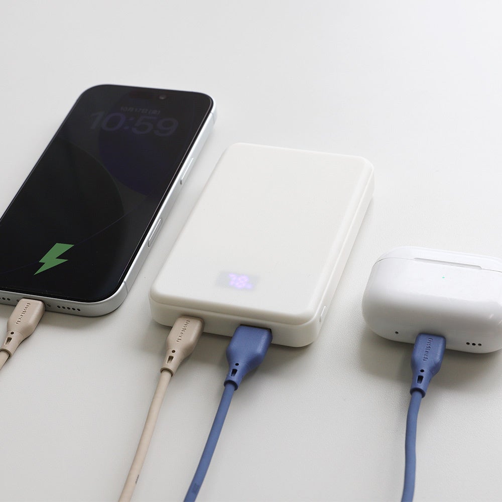 USB Type-CポートとUSB Type-Aポートを搭載し、合計最大5V/3A出力で2台の機器を同時に充電できます。スマートフォンとワイヤレスイヤホンなど、2つのデバイスを一度に充電できる便利な仕様です。