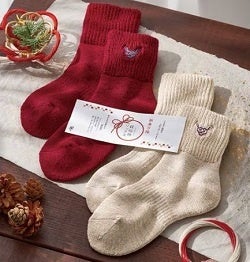 毎冬人気の肌側がふかふか総パイルのぶ厚いあったかソックスから、紅白をイメージした特別な2足組が新登場です。「人」「心」「縁」を結ぶ思いを込めて履き口に飾りあわじ結びのワンポイント刺しゅうを施しました。
