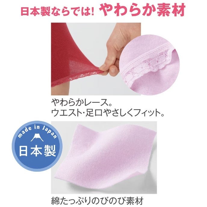 定番タイプの「脇に縫い目がないショーツ」は、サイドに縫い目がなくゴロつきにくい優しい肌触りが人気。さらにストレッチ性があり、しっかりとフィットしつつも綿たっぷりの優しい生地も人気の理由の一つです。そして今回の特別タイプは、素材のやわらかさにより、さらに快適に、窮屈感はありません。