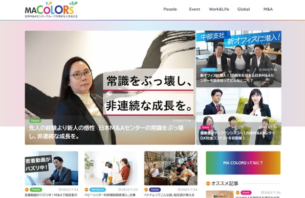 「MA COLORS」の「MA」は私たちの事業である「M&A」を表し、「COLORS」は「多彩なバックボーンを持つ人、多様な職種、働き方」を表現しており、”カラフル(多彩)な情報を発信する”という思いを込めました。「People」「Event」「Work&Life」「Global」「M&A」の5つのカテゴリーで、日本M&Aセンターグループの各部門で活躍する人、イベントレポート、働く環境や制度など、幅広い情報を発信していきます。