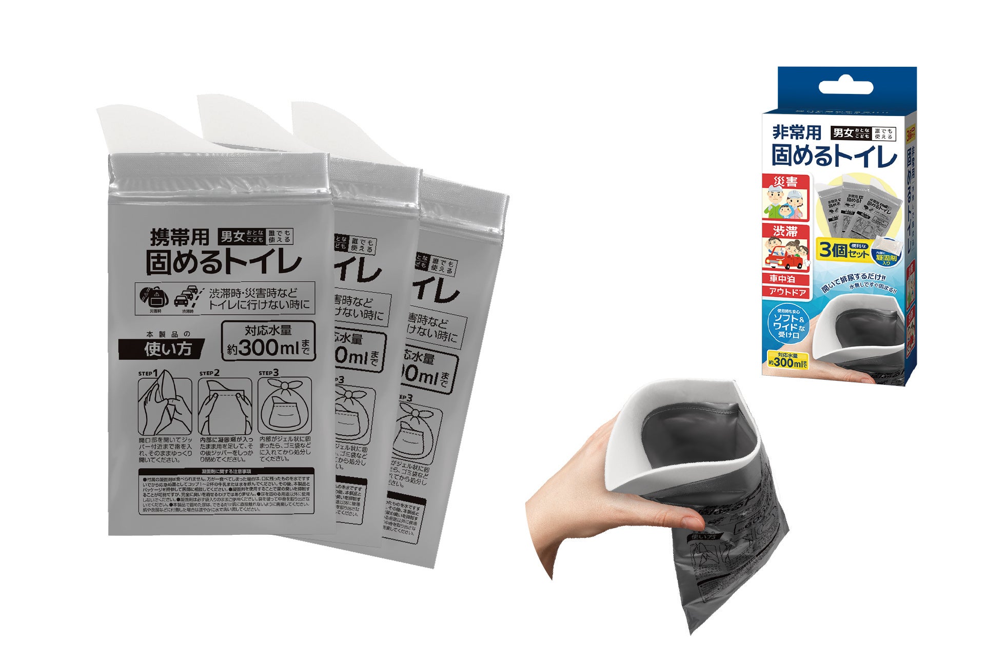 特徴:災害への備えはもちろん、渋滞などの緊急時に。ソフト&ワイドな受け口で、開いて排尿するだけで水なしですぐに固まります。お子様などのいるご家庭に、備えてあると安心なアイテムです。