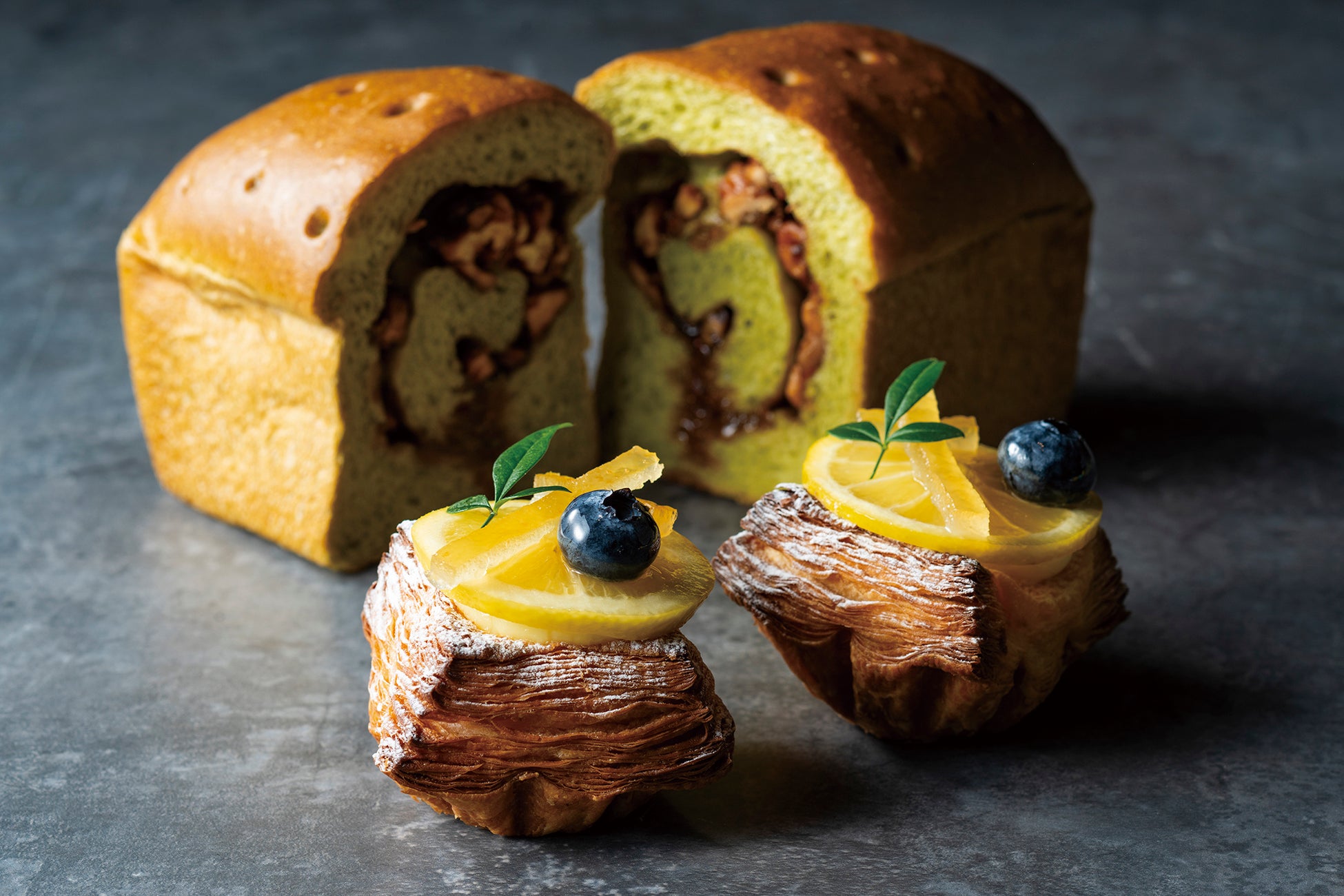 抹茶の生地でたっぷりのくるみのキャラメリゼを包みました。大きめにカットすることでくるみの食感とキャラメリゼのほろ苦さが感じられます。耳までやわらかくふわふわな生地の食感をお楽しみいただくため、焼き上がり当日にそのままお召し上がりいただくのがおすすめです。