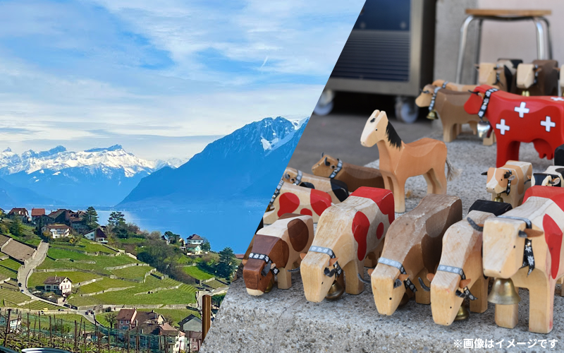 雄大なアルプスが広がるスイスは実は隠れたワイン大国!そのほとんどは国内で消費されており、国外にはわずか1%しか輸出されず、日本でもなかなかお目にかかれない国の一つです。いずれも軽快でフルーティーなワインを販売します。またスイス玩具(おもちゃ)でも遊べます!