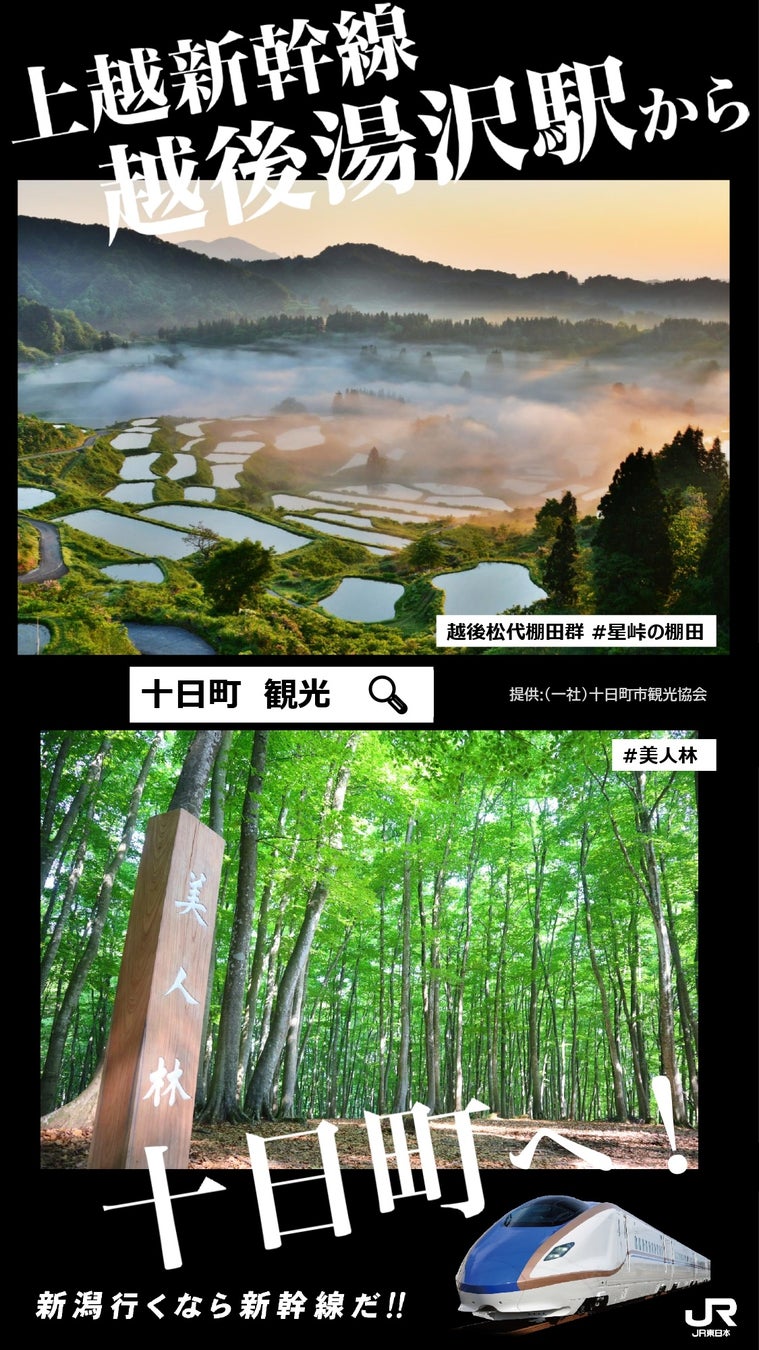 5月6日~19日のエリアプロモーションは、上越新幹線 越後湯沢駅から北越急行ほくほく線で訪れる十日町エリアをご紹介。十日町の観光スポット「清津峡」「星峠の棚田」「美人林」は新緑と水鏡の時期で、この時期にしか見られない景色です。