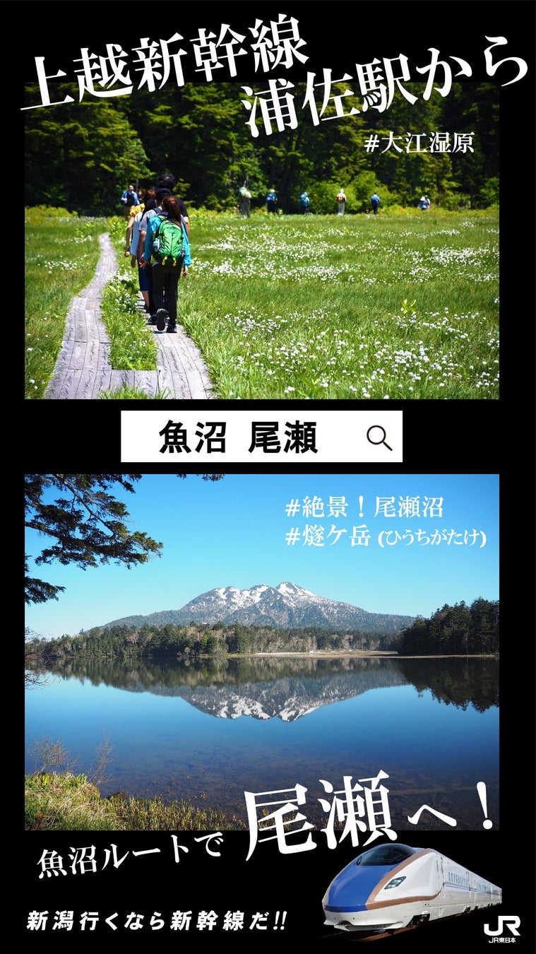 5月20日~6月2日のエリアプロモーションは、6月1日から運行開始する上越新幹線の浦佐駅から魚沼ルートで行く尾瀬をご紹介。新潟県・福島県・群馬県・栃木県の4県にまたがって広がる「尾瀬国立公園」。浦佐駅からバスと船で訪れる尾瀬は秘境ルートです。