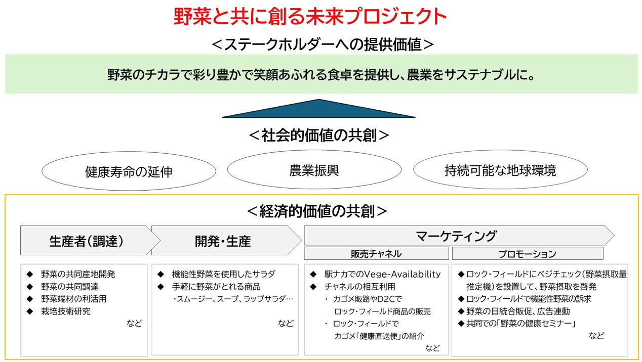 両社は共同で、新たに『野菜と共に創る未来プロジェクト』を立ち上げ、「健康寿命の延伸」のみならず「農業振興」「持続可能な地球環境」といった社会的価値と、双方の経済的価値を同時に追求することを通じて、野菜のチカラで彩り豊かで笑顔あふれる食卓を提供するとともに、サステナブルな農業を目指してまいります。