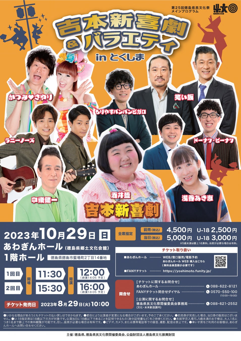 徳島県民文化祭開催委員会では、第25回徳島県民文化祭メインプログラムとして「吉本新喜劇&バラエティinとくしま」を開催します。