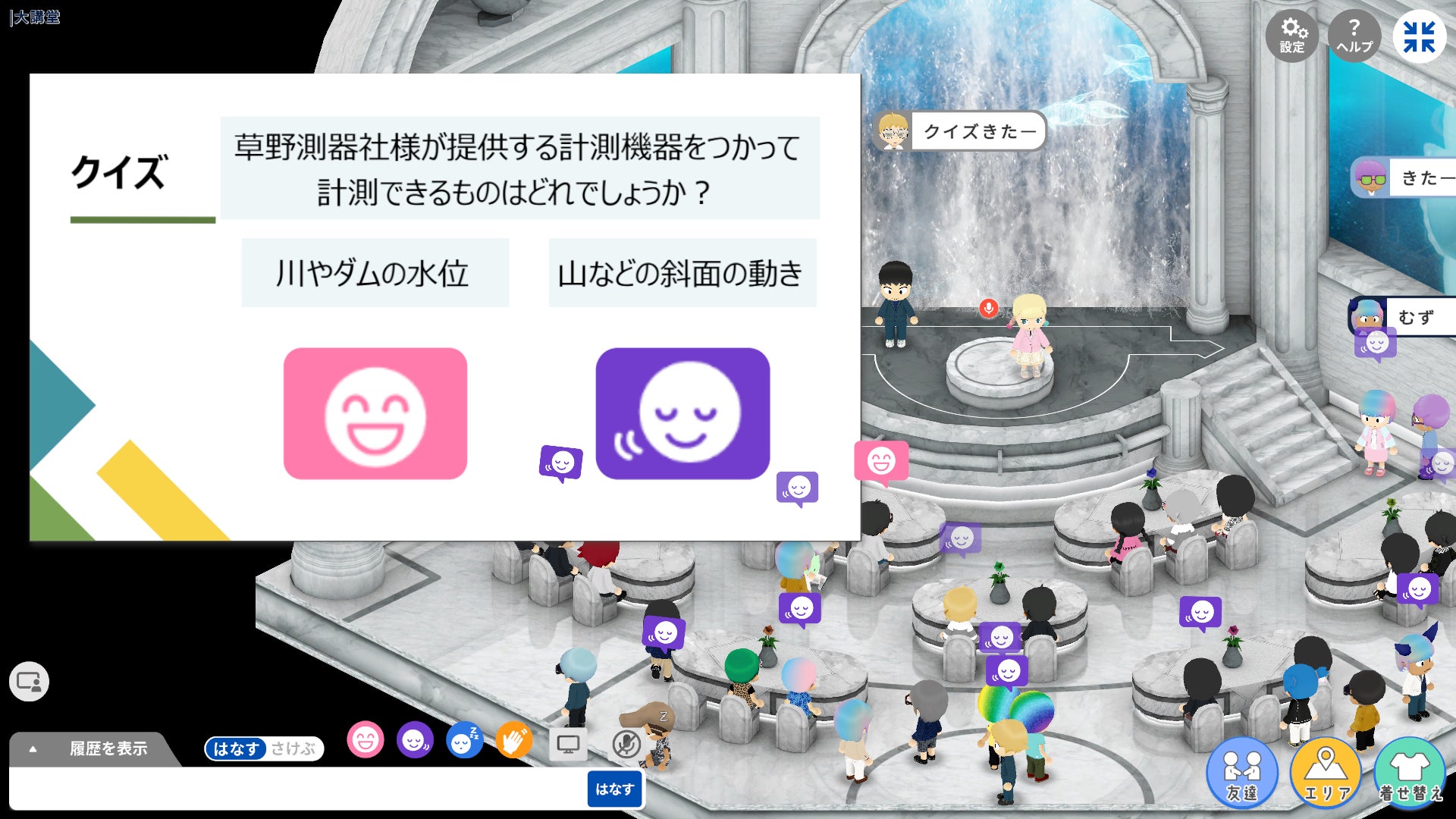 本イベントでは、登壇企業のプレゼン内容に関するクイズも用意されていました。参加者はメタバースの反応ボタンで回答します。二択のどちらかかと思いきや、両方正解も用意されており、会場では笑いマークが沸き起こっていました。