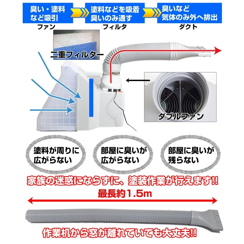 2重になっているフィルターで臭いのみを外へ排出し、嫌なシンナーのニオイ等を室内に充満させることなく作業することが出来ます。
