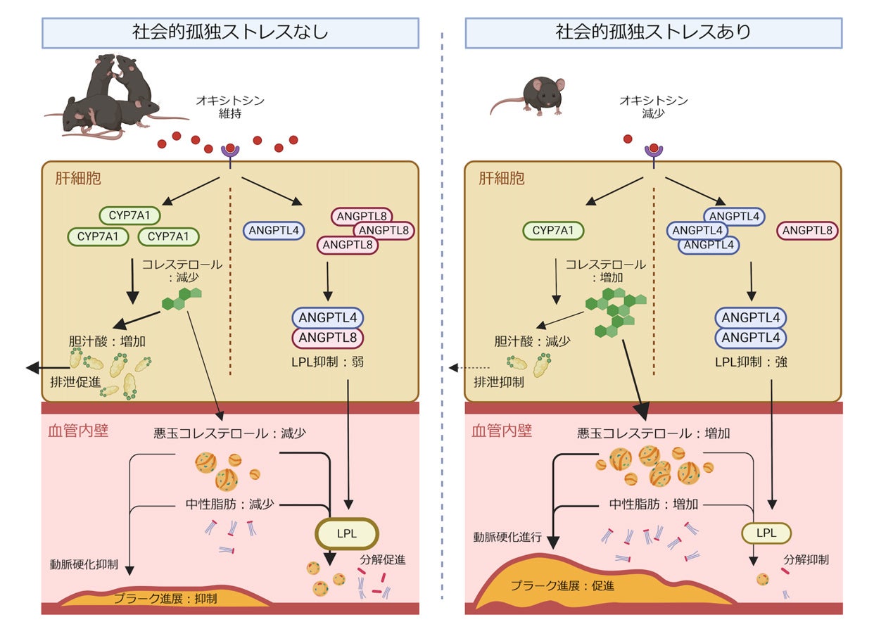 慶應義塾大学医学部内科学教室(循環器)の高聖淵助教(研究当時)、安西淳専任講師、家田真樹教授らのグループは、内科学教室(腎内分泌代謝)の木内謙一郎准教授、林香教授、先端医科学研究所(脳科学)の田中謙二教授、および自治医科大学の尾仲達史教授らのグループと共に、社会的孤独が脳視床下部でのオキシトシン分泌を減少させ、肝臓における脂質代謝異常を招くことで動脈硬化を促進させる新たな分子機序を発見しました。社会的孤独はヒトにおいて脂質代謝異常や動脈硬化を原因とする虚血性心血管疾患のリスクであることが報告されていましたが、その詳細な機序は明らかになっていませんでした。今回研究チームは社会性のあるマウスでも特に“絆”が深いとされる同胞マウスに限定して実験を行い、社会的孤独ストレスの影響を臓器横断的に検証しました。その結果、これまで推定されていた食事摂取量や体重の増加、交感神経系、視床下部-下垂体-副腎皮質系および炎症の活性化とは無関係に、社会的孤独ストレスが動脈硬化を進行させることを見出しました。またその機序として、脳視床下部で産生されるオキシトシンによる肝細胞を介した脂質代謝制御機構が破綻することが原因であることを明らかにしました。詳細な検討により、オキシトシンは肝細胞において、CYP7A1を介した胆汁酸の生成によるコレステロール排泄とANGPTL4およびANGPTL8を介したリポタンパクリパーゼ(LPL)活性制御による中性脂肪の分解という二つの機能を併せ持ち、全身の脂質代謝を制御していることを見出しました。さらに、オキシトシンを経口補充することで、社会的孤独による脂質代謝異常と動脈硬化が抑制されることを確認しました。