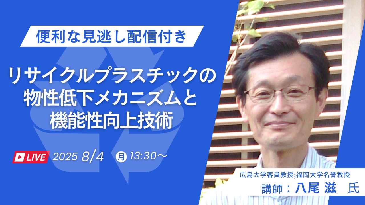 株式会社シーエムシー出版は、8月4日(月)に「リサイクルプラスチックの物性低下メカニズムと機能性向上技術」のライブ配信セミナーを開催します。