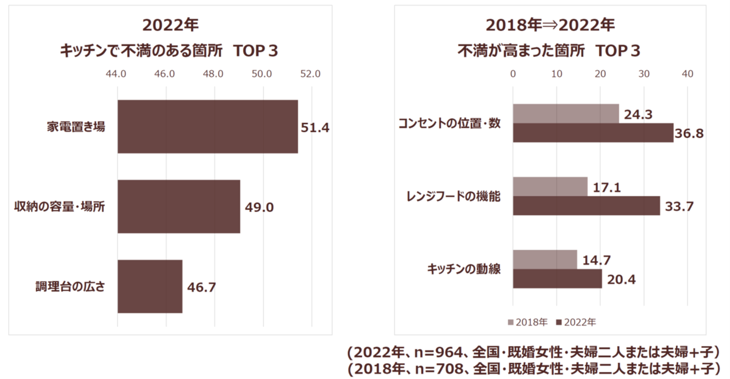 料理頻度が増えたことで改めて感じるキッチンへの不満を個別デプスインタビューで聞いてみると「キッチン家電の利用頻度が増え、コンセント数の不足を感じた」「汚れる機会も増えて、水回りやコンロの掃除が増えた」「家族みんながキッチンを使う頻度が増え、高さや収納の使い勝手が気になるようになった」という声が上がりました。オレンジページメンバーズへの調査でも「コンセント」「レンジフード」「キッチンの動線」という項目が、キッチンに感じる不満として変化が大きい項目の上位になりました。