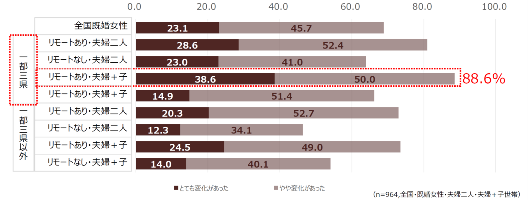 オレンジページメンバーズへの調査では、全体の69%が「暮らしに変化があった」と回答し、特に一都三県在住でリモートワーク経験者が88.6%と最多でした。