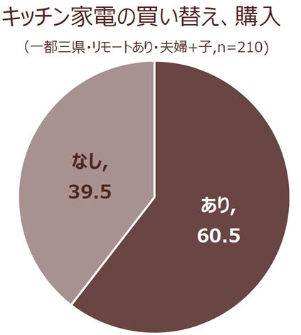 個別デプスインタビューでは「昼食作り」のように、料理頻度が増えたという声が多い結果となりました。その対処法を聞いてみると「同時調理ができるオーブンを利用する機会が増えた」「リモートワークの合間に仕込み、長時間かかる料理も気軽にできるようになった」という声が聞かれました。そのような調理を実現するために、キッチン家電を購入した方も多くおり、オレンジページメンバーズへの調査でも「コロナ禍で購入・買い替えたキッチン家電がある」と答えた方が60.5%となりました。