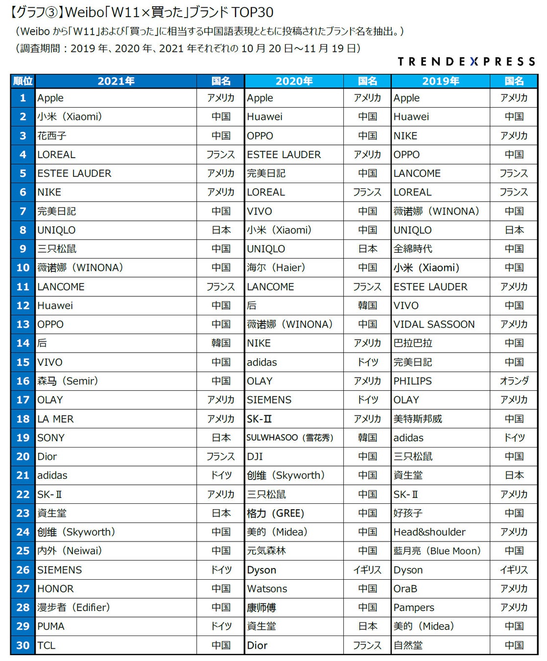 ・中国ブランドは、“中国のアップル”と称される「小米(Xiaomi)」が2位、“国潮コスメ”の代表格「花西子」が3位に躍進。「小米(Xiaomi)」は「Huawei(ファーウェイ)」に、「花西子」は「完美日記(PerfectDiary)」に代わって上位にランクインした印象。「中国ブランド vs外資系」だけでなく、中国ブランド間の競争も激化している。