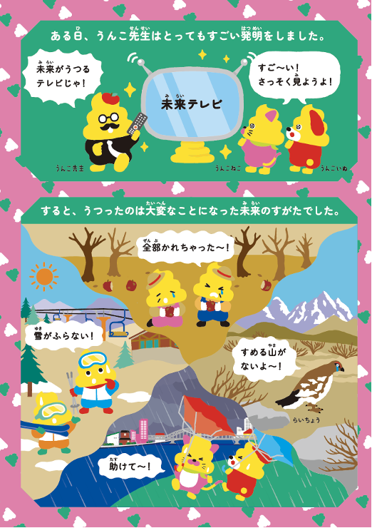 内容はクイズ形式で全5問。おなじみのうんこ先生が発明した未来テレビで、