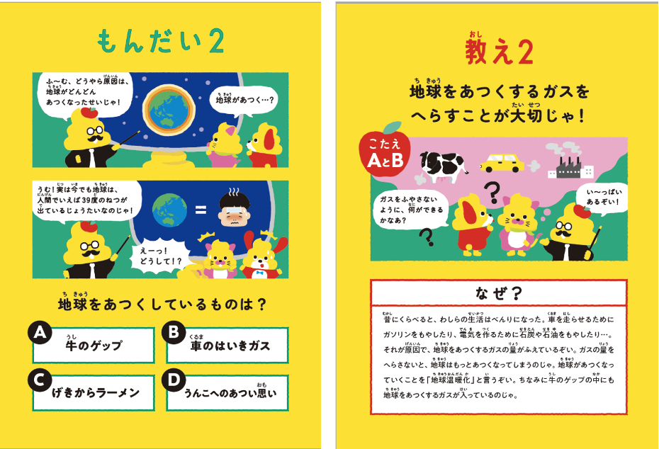 クイズの設問や選択肢には、うんこドリルでおなじみの「うんこ」というキーワードやイラストが。シュールなキーワードやイラストで読んでいるこどもの興味をひきつけながら、地球温暖化の仕組みや、よりよい未来にするための正しいアクションについて学べる内容となっています。
