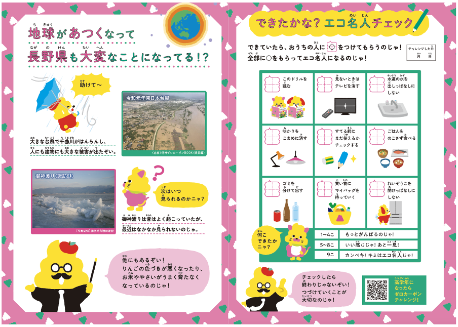 冊子の巻末には、地球温暖化による長野県での被害や影響について学べるページや、地球にやさしい「エコ名人」になるためのチェックリストが。うんこマスに◯をつけてもらいながら、楽しくチャレンジできます。