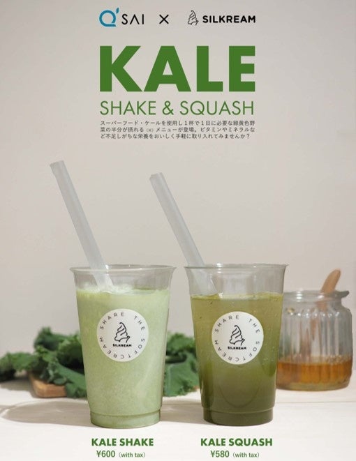 キューサイ株式会社(本社:福岡市中央区、代表取締役社長:佐伯 澄)は、ソフトクリーム総合メーカーである日世(本社:大阪府茨木市、代表取締役社長:吉田 文治)とコラボレーションし、国産ケール100%の「キューサイ 青汁のある食卓」を使用した新商品「KALE SHAKE(ケールシェーク)」と「KALE SQUASH(ケールスカッシュ)」を4月20日(水)から5月31日(火)までの期間限定で日世の直営店「SILKREAM(シルクレーム)阪急三番街店」にて販売することをご報告いたします。