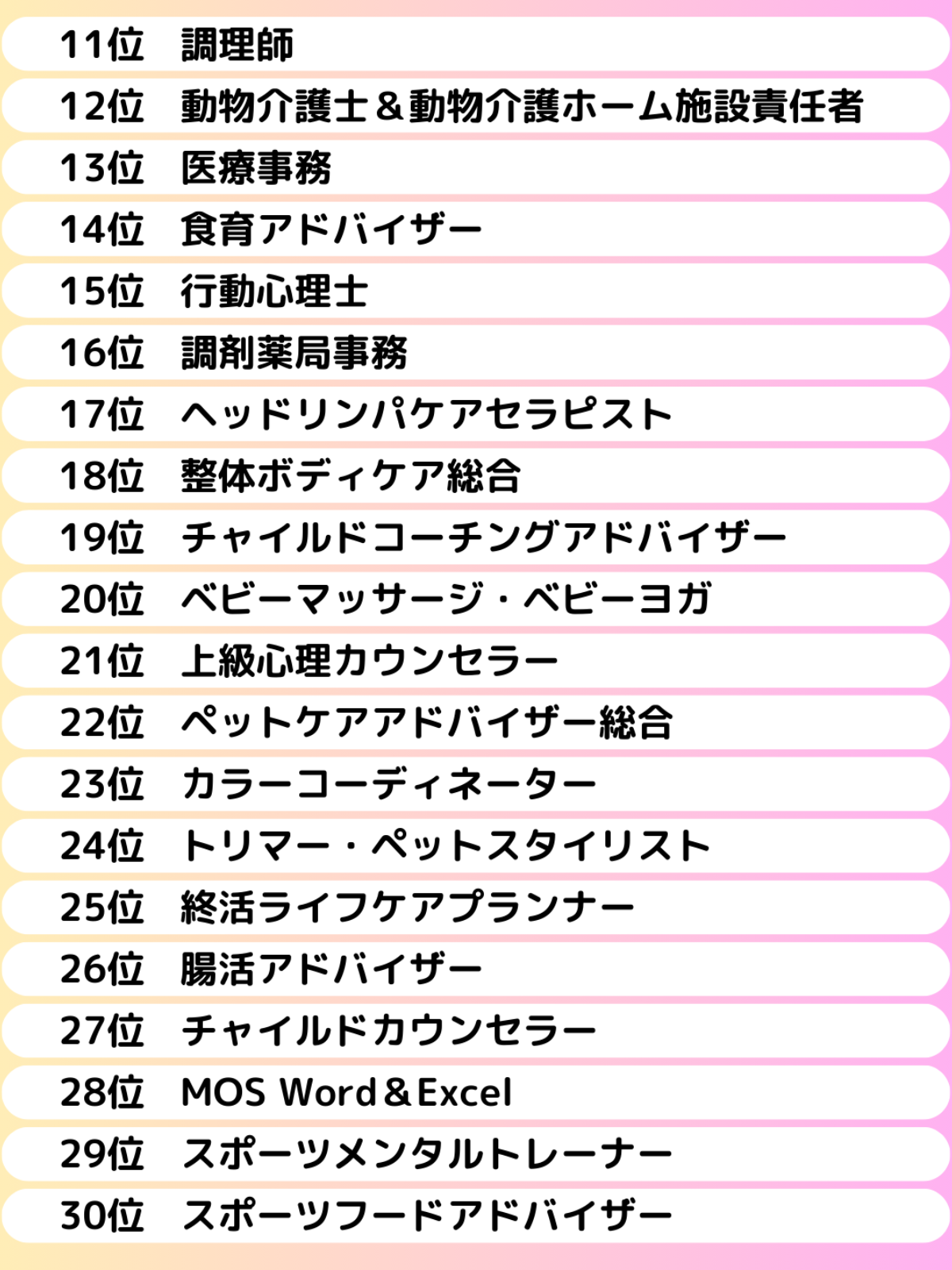 第4位は保育士がランクイン。保育士の合格率は全国平均でみると20%前後であるのに対し、本講座を受講した卒業生の合格率は驚異の63.7%!独学でチャレンジしたけど不合格となり、本講座を受講して 合格を勝ち取った受講生様も大勢います。保育士ニーズは依然として高く、女性に人気の職業であることも相まって、人気が継続しています。
