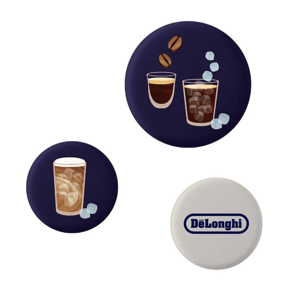 イベントにご来場いただき、デロンギ公式LINEアカウントを友だち追加・アンケート回答にご協力いただいた方各日先着100名様に無料で、イベント限定デザインのデロンギオリジナル缶バッジ3個と、デロンギ公式オンラインショップでお得にお買い物ができるイベント限定オンラインクーポンのセットをプレゼントいたします。