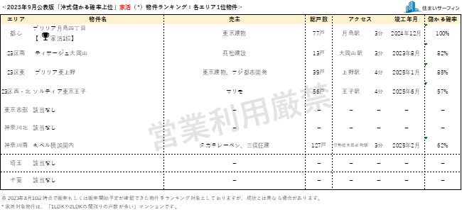 [住まいサーフィン]資産性の保たれやすいマンションがわかる首都圏エリア別「沖式儲かる確率上位マンションランキング」2023年9月版公表