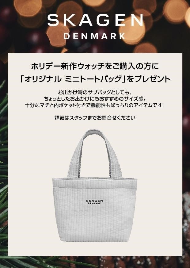 アメリカ・テキサス州に本拠地を持つFossil Group, Inc. の日本現地法人である株式会社フォッシルジャパン(所在地:東京都豊島区、代表取締役社長:中井 直)は、「SKAGEN(スカーゲン)」において2023年ホリデー新作コレクションの発売に合わせ、2023年11月14日(火)から、ご購入者に「SKAGENオリジナル ミニトートバッグ」をプレゼントするキャンペーンを、時計専門店オンタイム / ムーヴにて開催いたします。