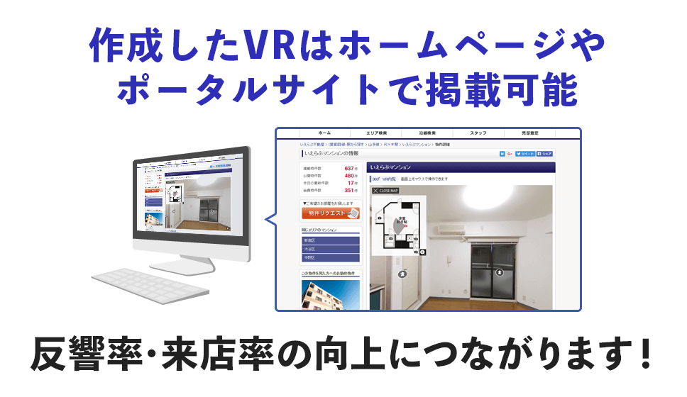 仲介会社は、作成したVRコンテンツを自社HPに掲載することで集客力を高められるほか、VR内見に活用して内見業務を効率化できます。管理会社は、退去前から物件の案内ができるため、空室期間の短縮や、オーナー満足度の向上が期待できます。
