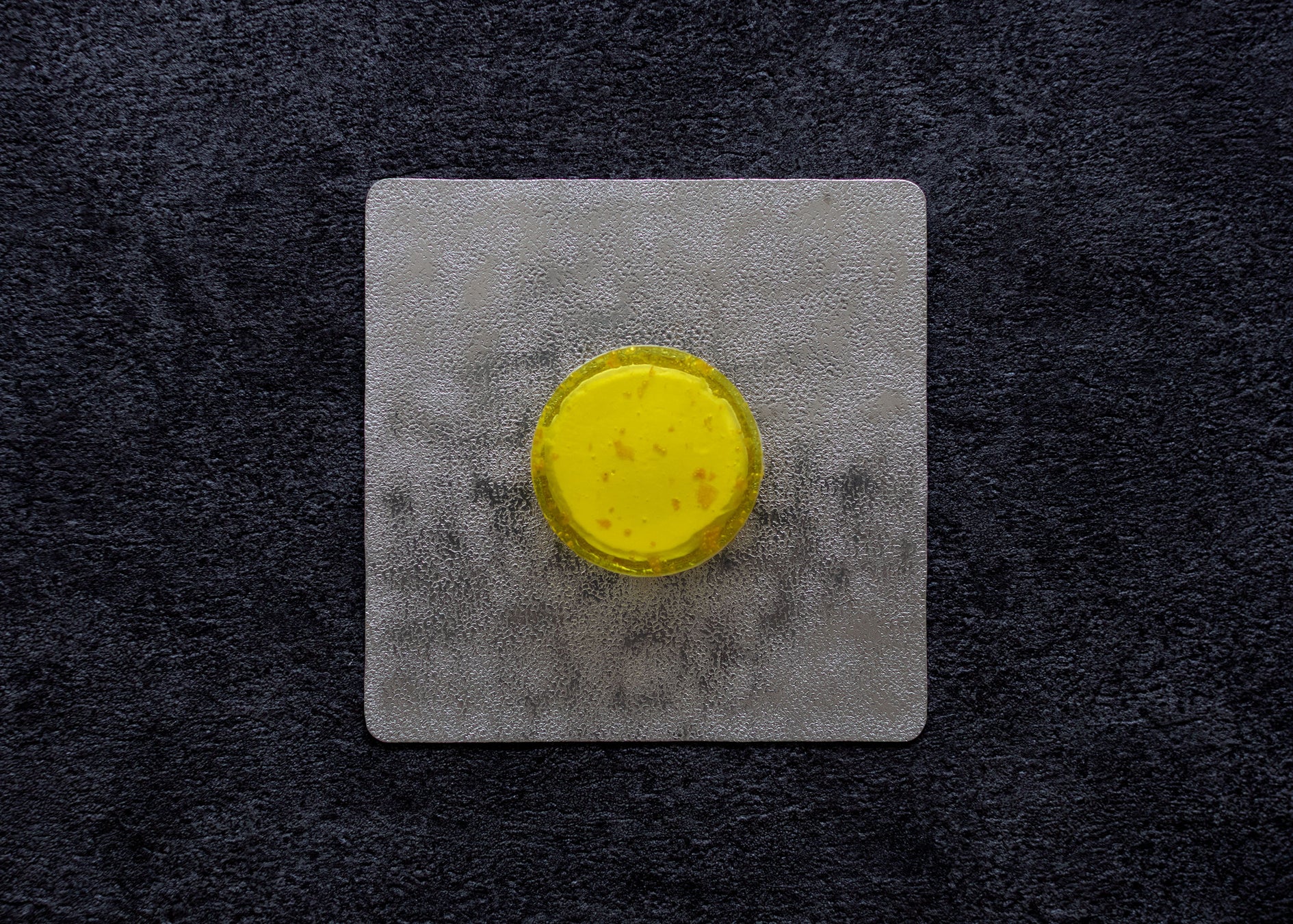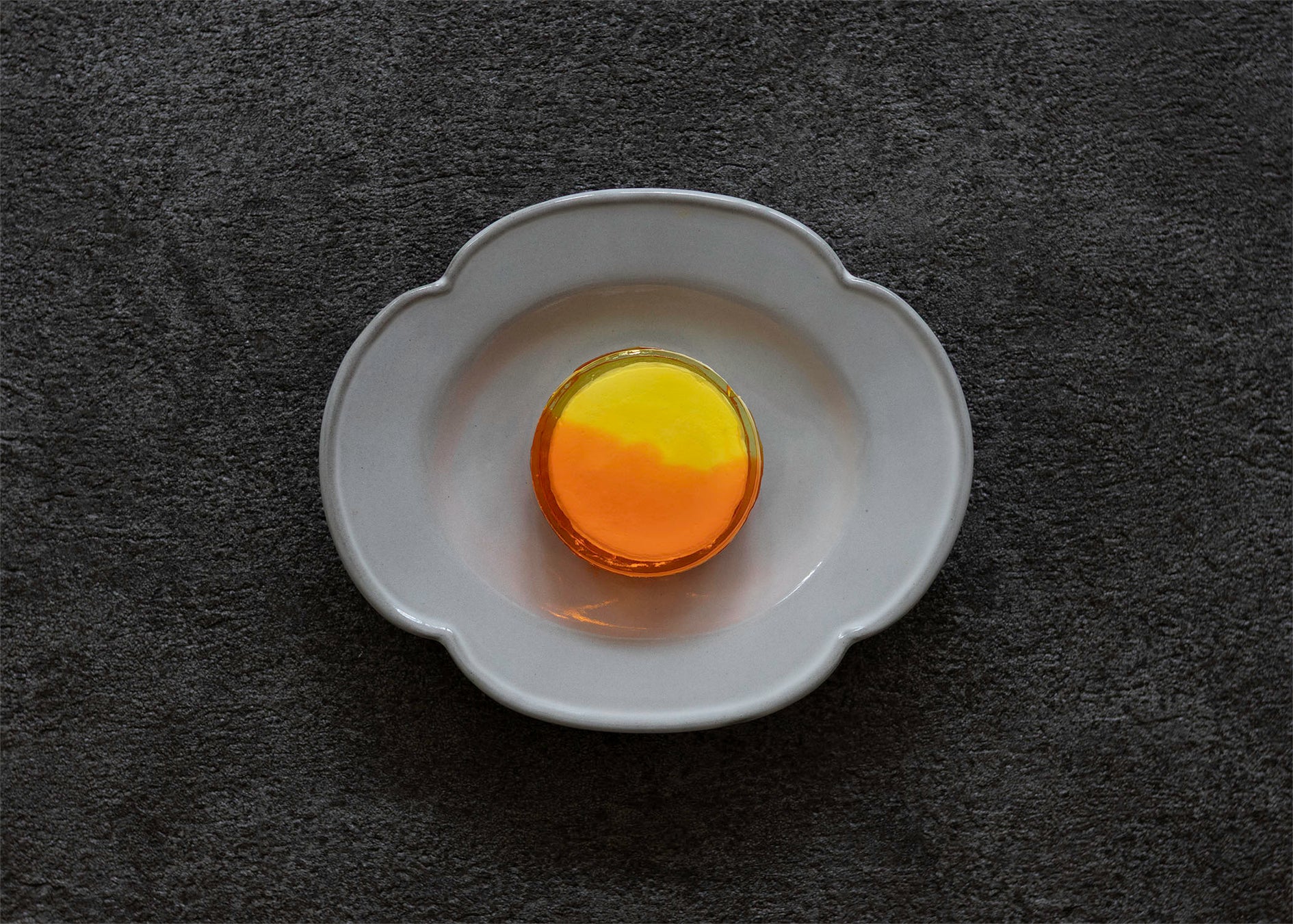 月は満、夜は澄。 透明の縁に冷えた空気を、中央のやわらかな黄に光を託す、満月夜の透明感。 瀬戸田レモンのピールが星のように瞬く。秋の〈望月〉をミニマルに表現したバターサンド。 ほんのりレモン風味の琥珀羹とフレッシュバターのミルク感の、ピュアな味わい。