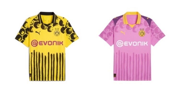伝統とアートが融合。ブラックとイエローのクラシックな配色に、手描きのグラフィックを重ねてエネルギッシュな印象に。GKキットはピンクをベースにイエローのアクセントを施し、肩にはハニカム構造に着想を得た六角形の模様。