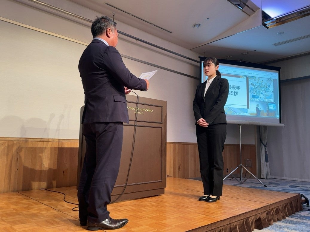 また、会場にいない社員も内定式の様子が分かるよう、コミュニケーションツール「oVice(オヴィス)」上のバーチャル空間で生中継にて配信し、バーチャル空間から拍手を送るなど、一緒に式典を見守りました。